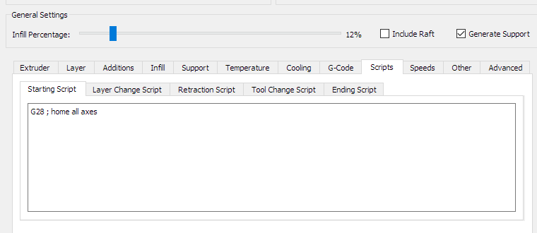 As the firmware print process has changed slightly, it may be necessary to update your slicer scripts accordingly. Scripts can be found in Simplify 3D by opening Process Settings, and locating the Scripts tab of the interface. It is no longer necessary to have a M98 command in the starting script, so it's simplified considerably. Consider using G28 in the starting script to home the machine on print start, as this will ensure everything is started correctly and prevent errors. Additionally, any purge commands can be added here as well, although using skirt or brim on the print is normally sufficient to get material flowing. A default purge command can be activated by adding a purge command as in the below example, this should only be used at the beginning of the print.